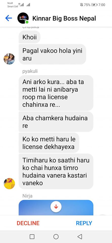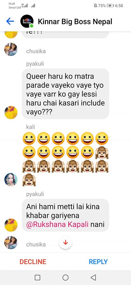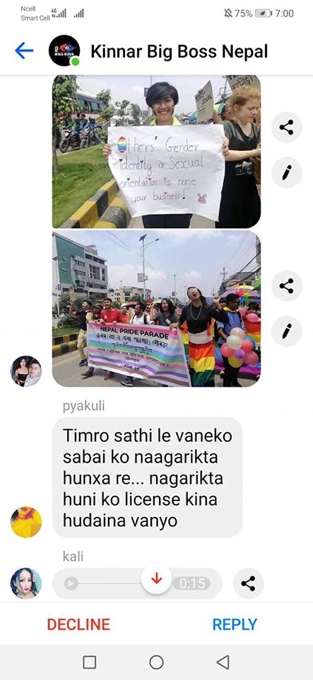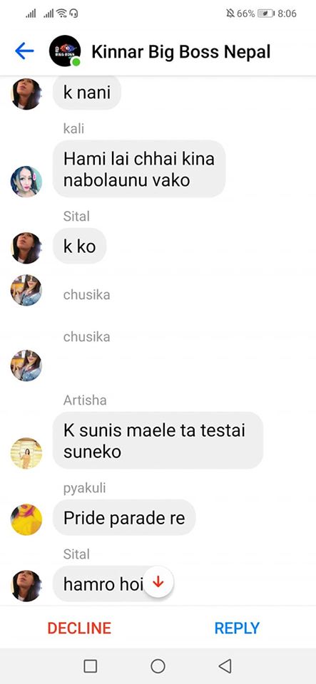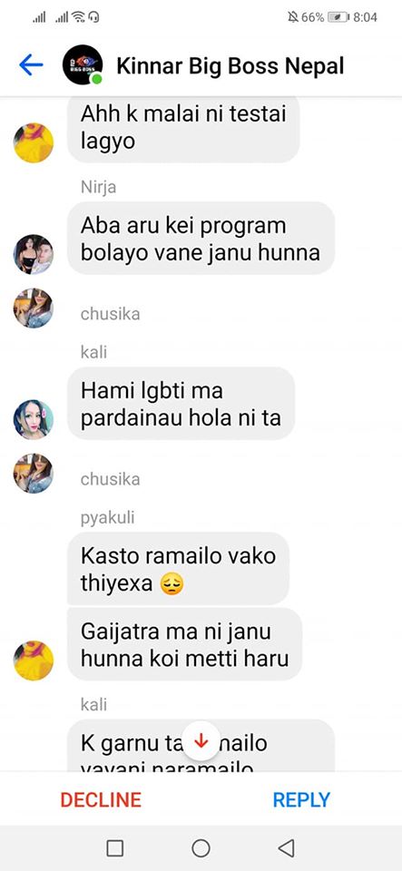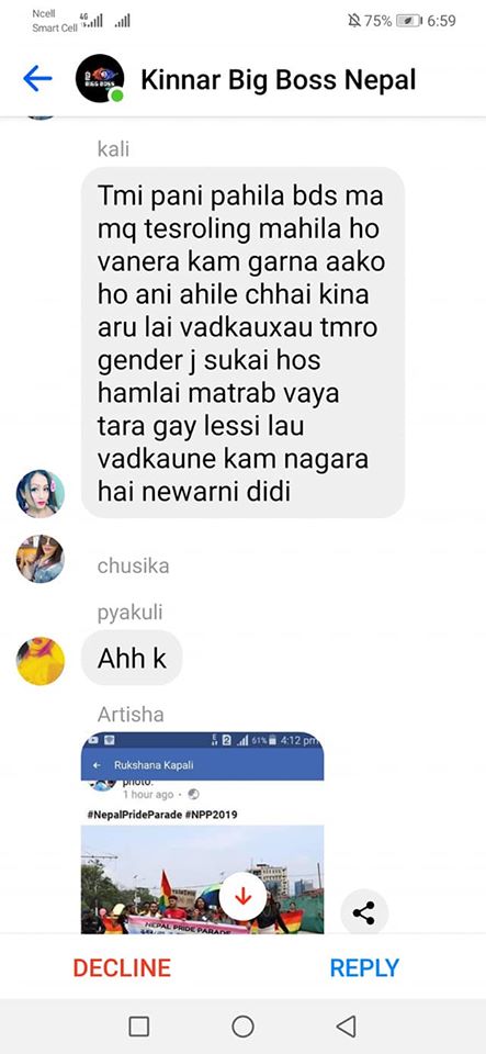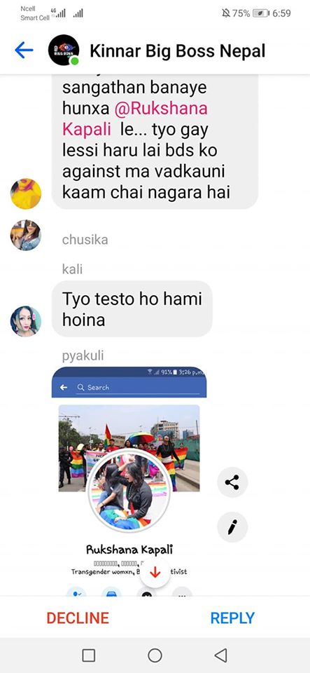 Moreover, the president of the Blue Diamond Society, Pinky Gurung, was also present in the group chat. She neither criticized the messages, nor did she attempt to stop the verbal assault. In the messages, she appears at the beginning where she mentions that the Pride Parade was organized by “rucsana haru le queer group ko gareko” and again in the middle where she answers a question by saying “i am transgender attract with any gender vanxa”.