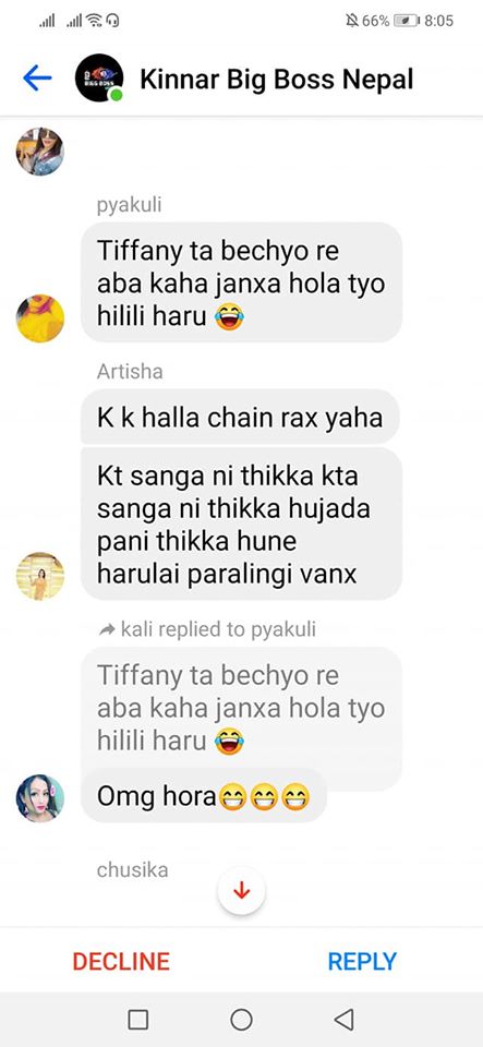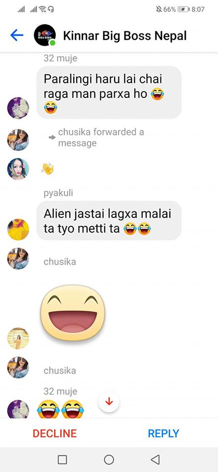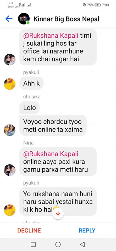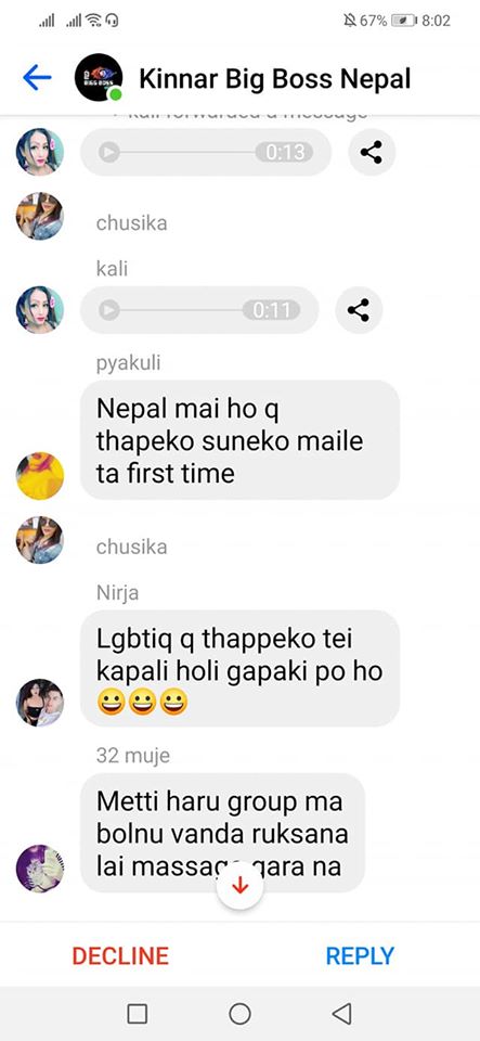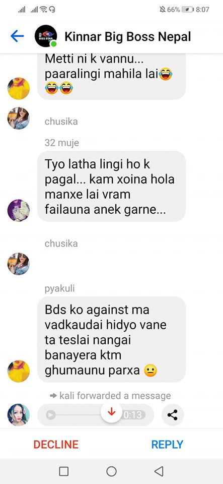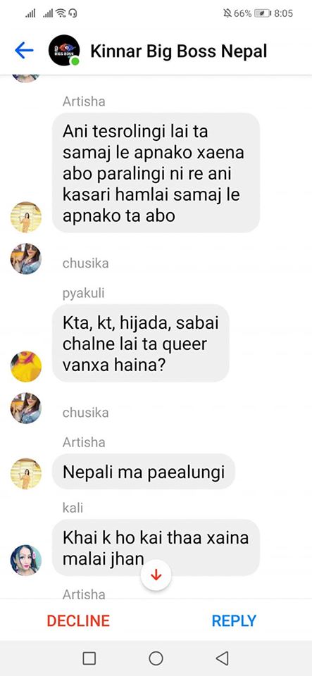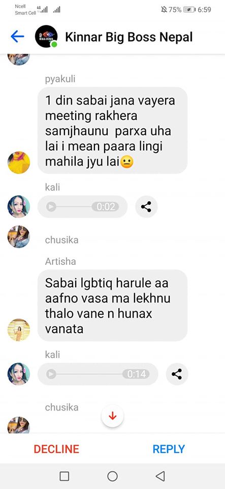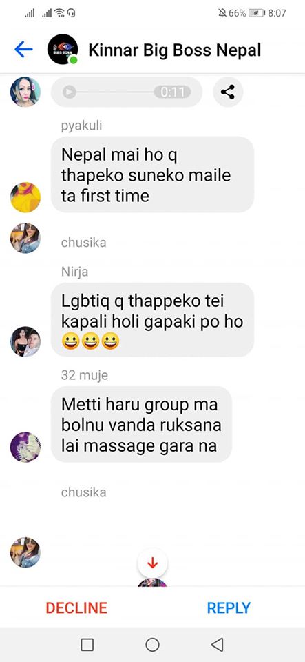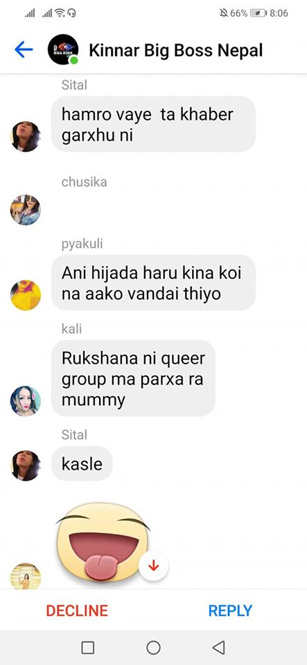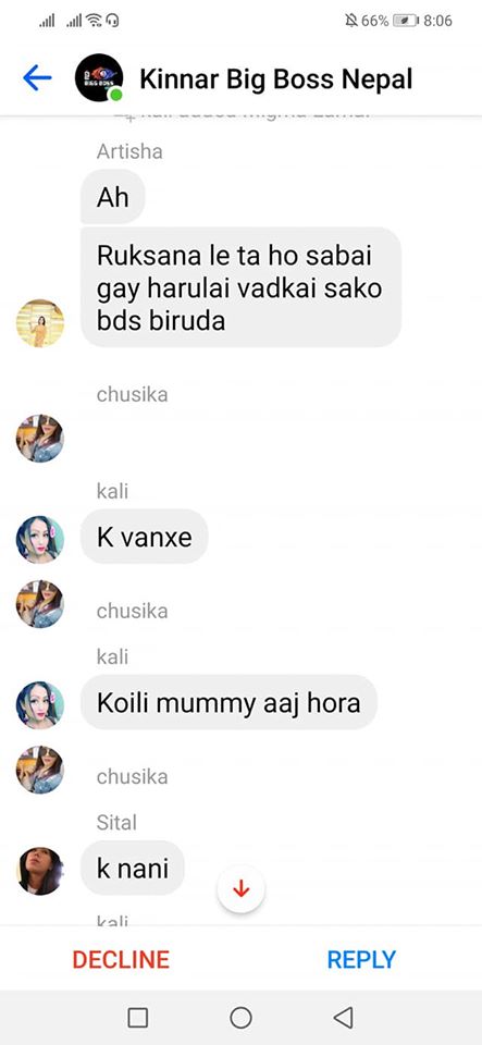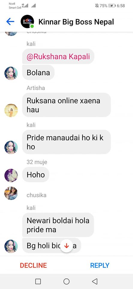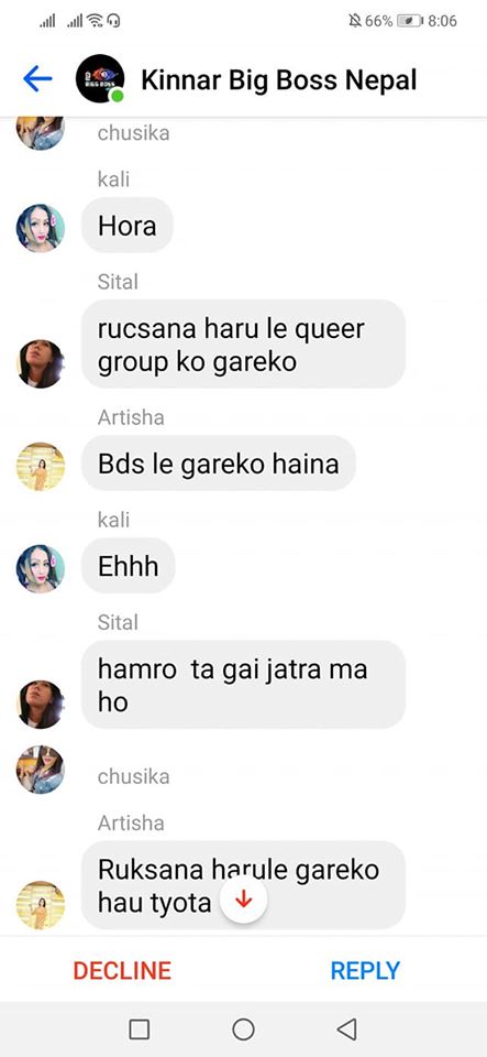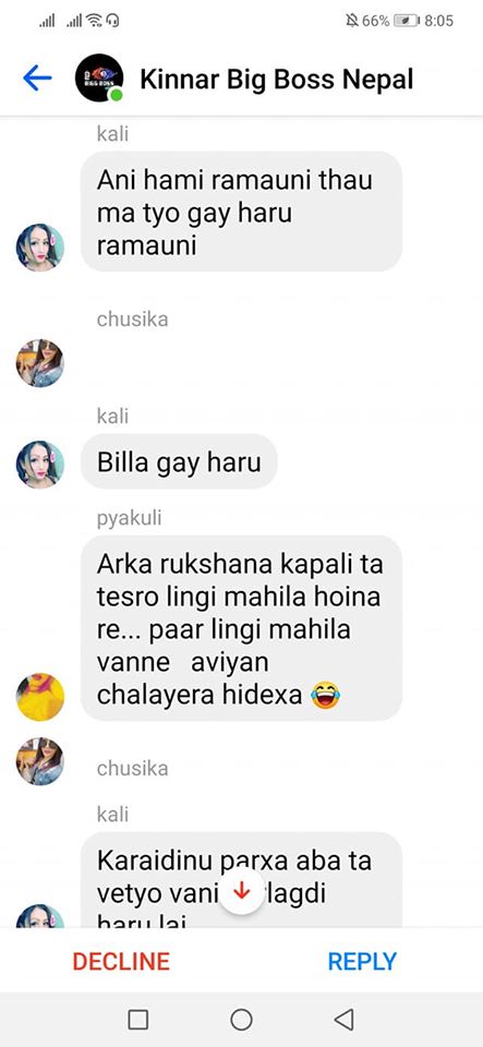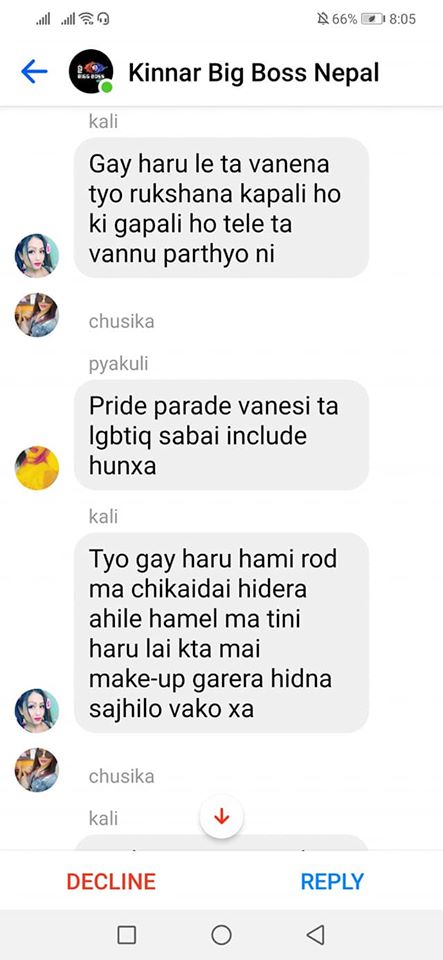 On the same day, one of the organizers, Rukshana Kapali, was added by Roli Shrestha to a Facebook group chat called “Kinnar Big Boss,” which had more than 50 members. Since she was added by a person who wasn’t friends with her, it went into the filtered messages. Consequently, before she could click on accept or decline, she saw a long scroll of messages targeting her.