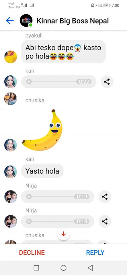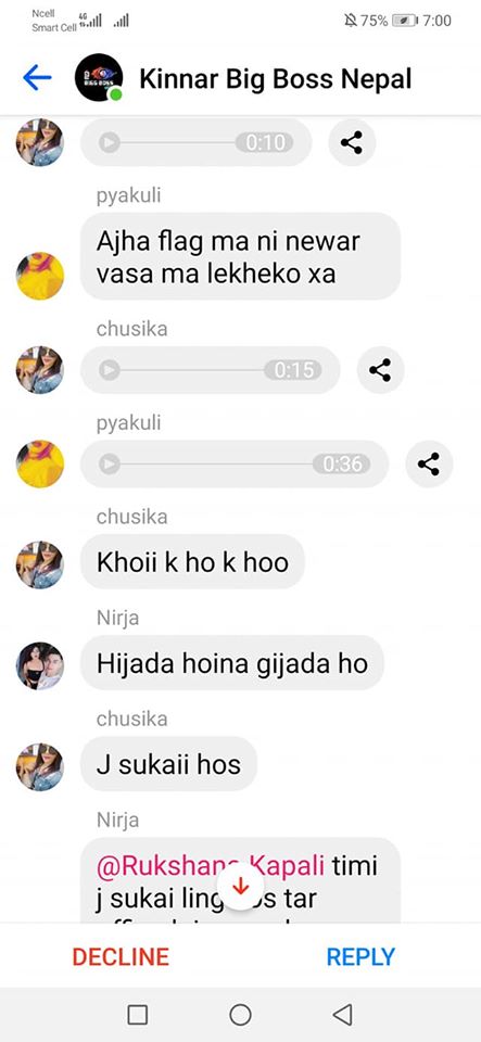 The conversations sent prior to Rukshana’s addition to the group was also accessible. In the group chat, Roli Shrestha, Zoya Gurung, Nirja Lama, Artisha Rana and many other people with aliases, and anonymous accounts verbally assaulted Rukshana.